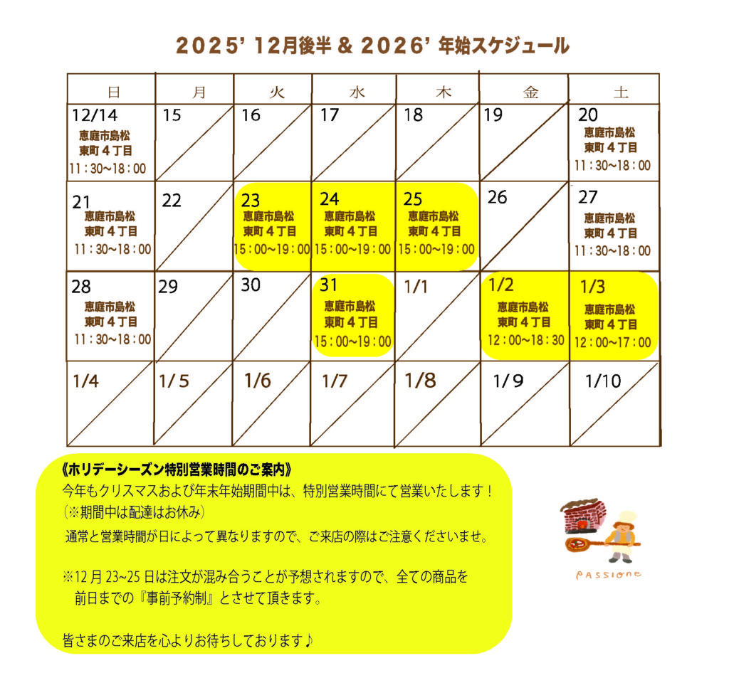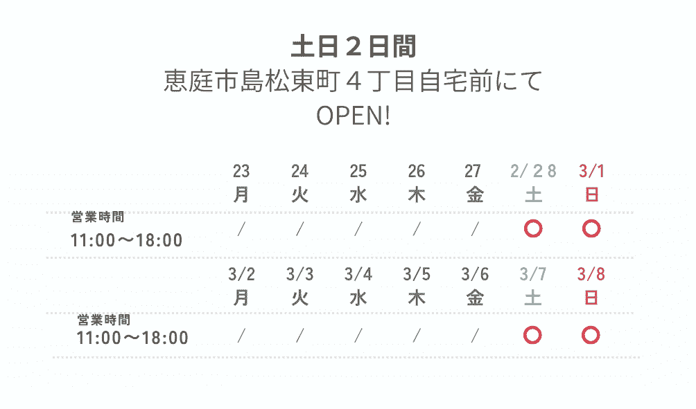 ※祝日の時や移動出店などの都合により営業日が変更する場合あり。